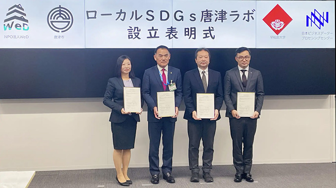「唐津ラボ」設立表明式の様子。(左より)WeD 吉森旭希代表理事、唐津市 峰達郎市長、早稲田大学 早田宰教授、日本データー 池智太郎(代表取締役社長)
